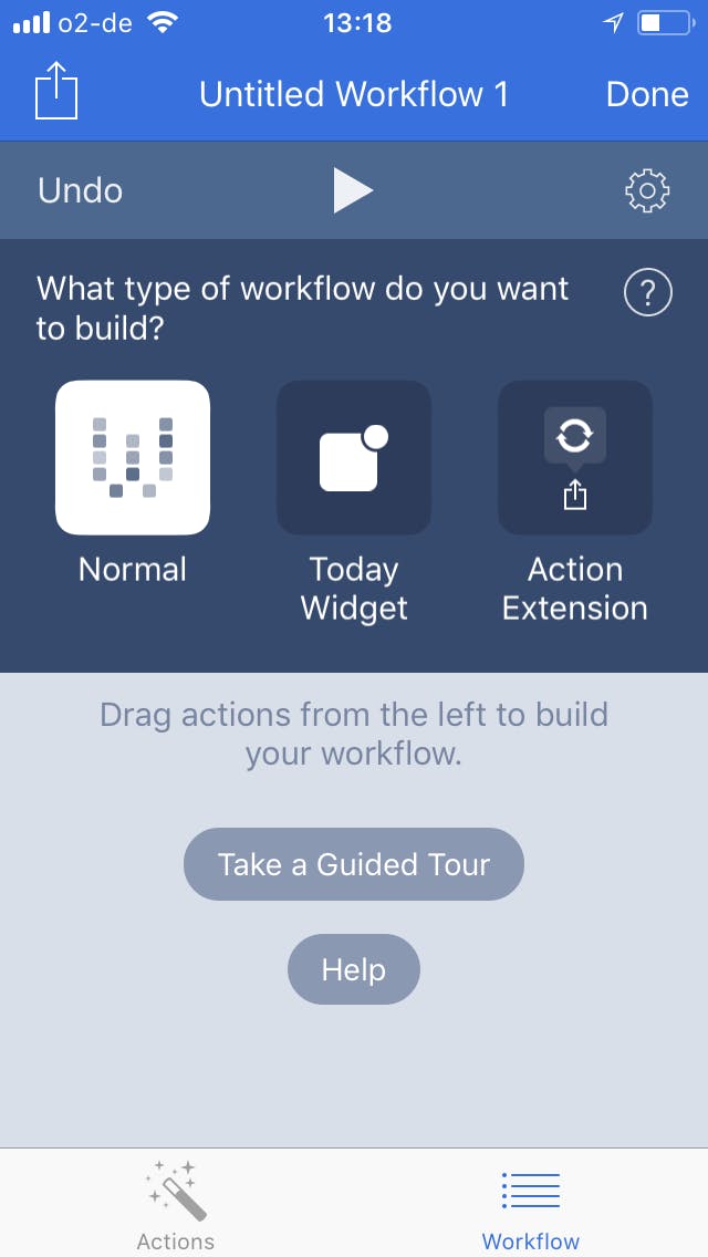 Heb je hulp nodig bij het bouwen van je workflow, tik dan onderin op Take a Guided Tour of kies voor de Help-knop. Je wordt naar de handleiding van Workflow geleid.
