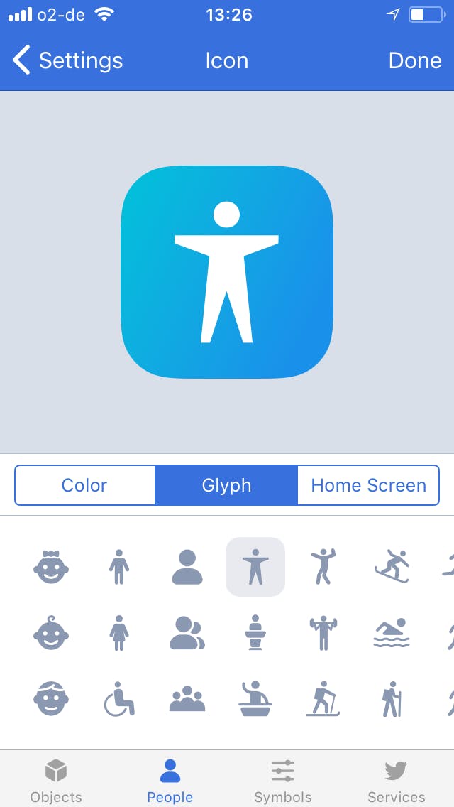 Geef je workflow een naam door op het tandwiel te tikken, hier kun je ook tijdens het maken van je workflow nog het type veranderen overigens. Tik op Icon om het icoontje van je nieuwe workflow te veranderen. Je kunt een andere kleur selecteren, een andere afbeelding kiezen door op Glyph te tikken of selecteer een foto door op Home Screen te tikken. Selecteer Done om terug te gaan naar het overzicht.