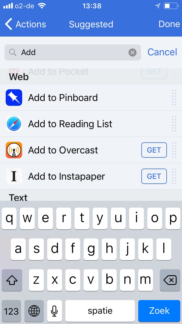 Je zult zien dat achter sommige acties een knop met de tekst GET staat. Dit betekent dat de actie niet in de standaard bibliotheek van Workflow zit. Dit zijn meestal acties voor bepaalde apps die je niet op je systeem hebt staan. Zodra je op GET tikt, wordt er verbinding met de App Store gemaakt en kun je de desbetreffende app downloaden.