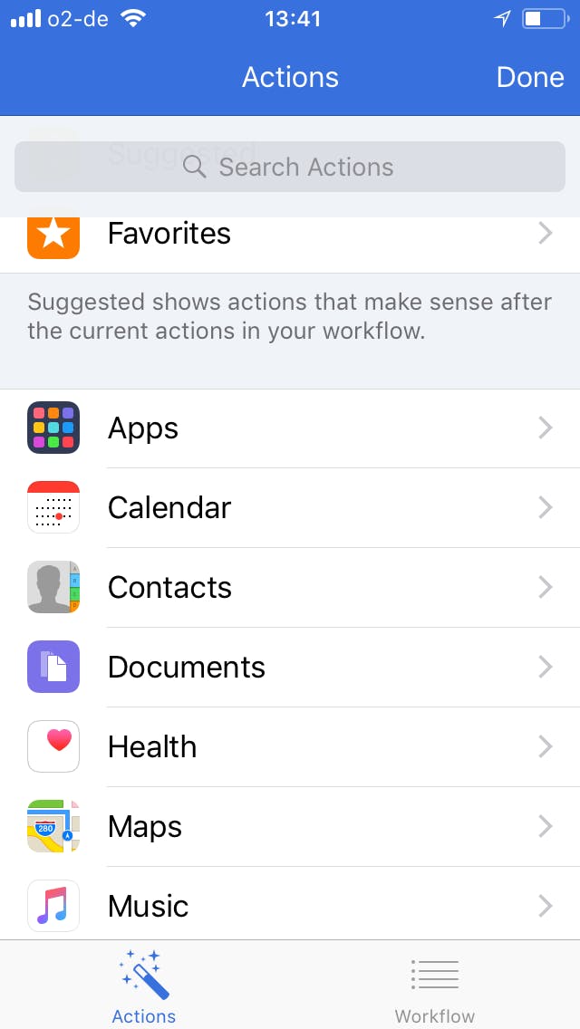 Een Today Widget is een widget die je vanuit het widget-menu kunt draaien. Je vindt het widget-menu door vanuit het hoofdscherm op je iPhone naar rechts te vegen. Onderaan zie je twee weergavevensters, de rechter is standaard weergegeven en heet Workflow. Deze bevat alle afzonderlijke acties. De acties vind je door linksonder op Actions te tikken.