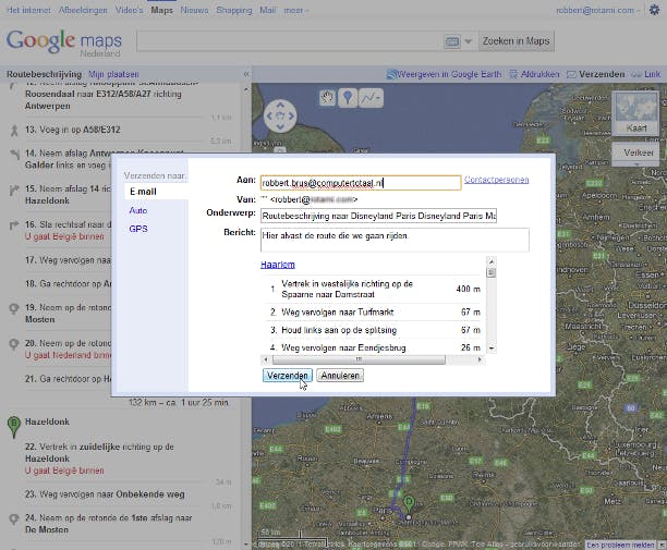 Om de route per e-mail te verzenden, klikt u rechtsboven op Verzenden.