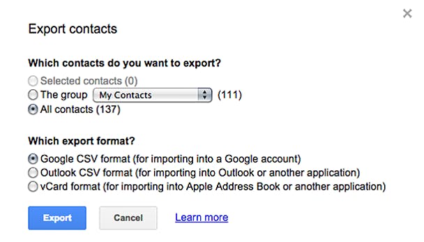 Met Google Contacts kun je ook al je contacten exporteren, in Google CSV-formaat om in een andere Google-account te importeren, in Outlook CSV-formaat om in Outlook of een andere applicatie te importeren of als vCard-formaat voor Apple Address Book. Selecteer de contacten die je wilt exporteren en kies More > Export contacts. Kies nu een bestandsformaat en klik op Export.