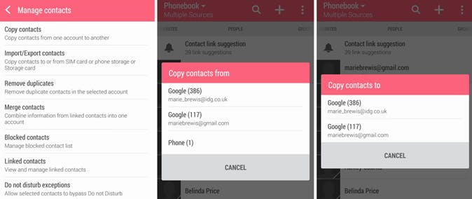Op onze HTC Desire Eye is de bovenste optie Copy contacts. Druk hierop en kies ervoor om contacten vanaf Phone te kopiëren. Er wordt vervolgens gevraagd waar je contacten naartoe wilt kopiëren, dus selecteer Google-account.