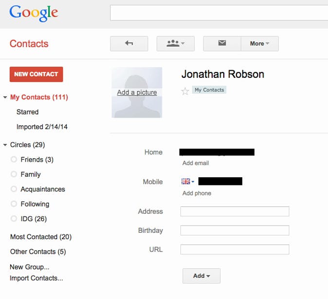 Je kunt op een contactpersoon klikken om de informatie aan te passen: een foto, adres, verjaardag, website en notities toe te voegen, evenals telefoonnummers en e-mailadressen.