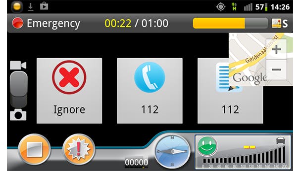 Rechtsboven wordt een kadertje van Google Maps getoond met je huidige locatie, terwijl in het midden het beeld getoond wordt. Rechts onderaan krijg je informatie over je snelheid te zien. De opname stopzetten doe je door nog eens op het bolletje linksonder te klikken. Wanneer je een ongeluk hebt gehad, klik je op het uitroepteken. Je kunt dan met een druk op de knop het ingestelde noodnummer bellen of er een sms naar sturen.