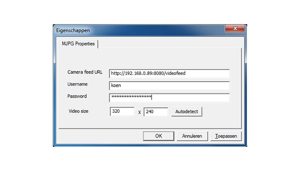 Vul in de instellingen bij Camera feed url http://IP:8080/videofeed in, waarbij IP het IP-adres van je telefoon is. Vul indien nodig de gebruikersnaam en het wachtwoord in en klik op Autodetect om de resolutie van de camera te detecteren. Klik op OK, waarna je de camera kunt gebruiken in elk Windows-programma dat de DirectShow API voor usb-camera's ondersteunt.
