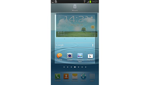 Wil je een onderdeel verwijderen, dan hou je een vinger op de app of widget en wacht tot je een korte trilreactie merkt. Je ziet nu dat bovenin beeld een prullenbakje is verschenen. Sleep het onderdeel hier naartoe om het te verwijderen. Door het tegen de linker- of rechterzijkant te slepen verplaats je de app of widget naar een van je andere startschermen.