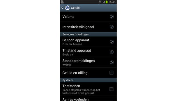 Een andere beltoon of een afwijkend meldingsgeluid voor berichten? Of ben je die irritante toetsgeluidjes helemaal zat? Ga naar Instellingen en kies Geluid. Hier kun je terecht om ze te wijzigen en de trilstand bij de meldingen aan te passen. Heb je een leuk deuntje op je computer en wil je dat gebruiken als ringtone of meldingsgeluid? Sluit dan je Galaxy aan op de pc en kopieer het bestand naar de map Ringtones of Notifications. Het bestand komt nu in de keuzelijst te staan die je ziet als je in de instellingen je ringtone- of meldingsgeluid wijzigt.