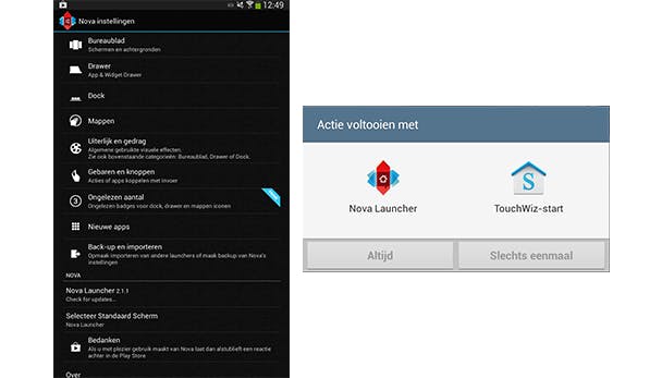 Is het allemaal nog niet persoonlijk genoeg? We gaan nog een stapje verder. We beginnen met het instellen van een volledig nieuw startscherm. Zoek hiervoor de app Nova Launcher op in de Play Store. Druk na installatie hiervan op de home-knop onderop je toestel, waarna wordt gevraagd of de actie met TouchWiz-Start of Nova Launcher moet worden uitgevoerd. Kies NovaLauncher en eventueel Altijd.