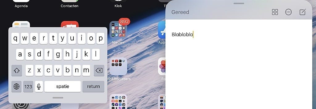 Deze truc komt wel eens van pas als je meerdere vensters in split-view met eventueel een daar weer overheen liggend zwevend venster in beeld hebt. Het reguliere grote toetsenbord kan dan – zeker in liggende beeldweergave – veel te veel ruimte innemen om nog praktisch te zijn. Het zwevende mini-toetsenbord is dan een stuk handiger.