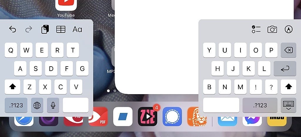 Er is ook een soort van gulden middenweg qua toetsenbordgrootte in de vorm van een gesplitst schermtoetsenbord. Let op: deze truc werk alléén op iPad’s met een schermgrootte kleiner dan 11 inch. Apple beschouwt de grotere schermen als zinloos voor deze feature; de kans is dan ook groot dat deze functie over een paar jaar gewoon niet meer werkt.