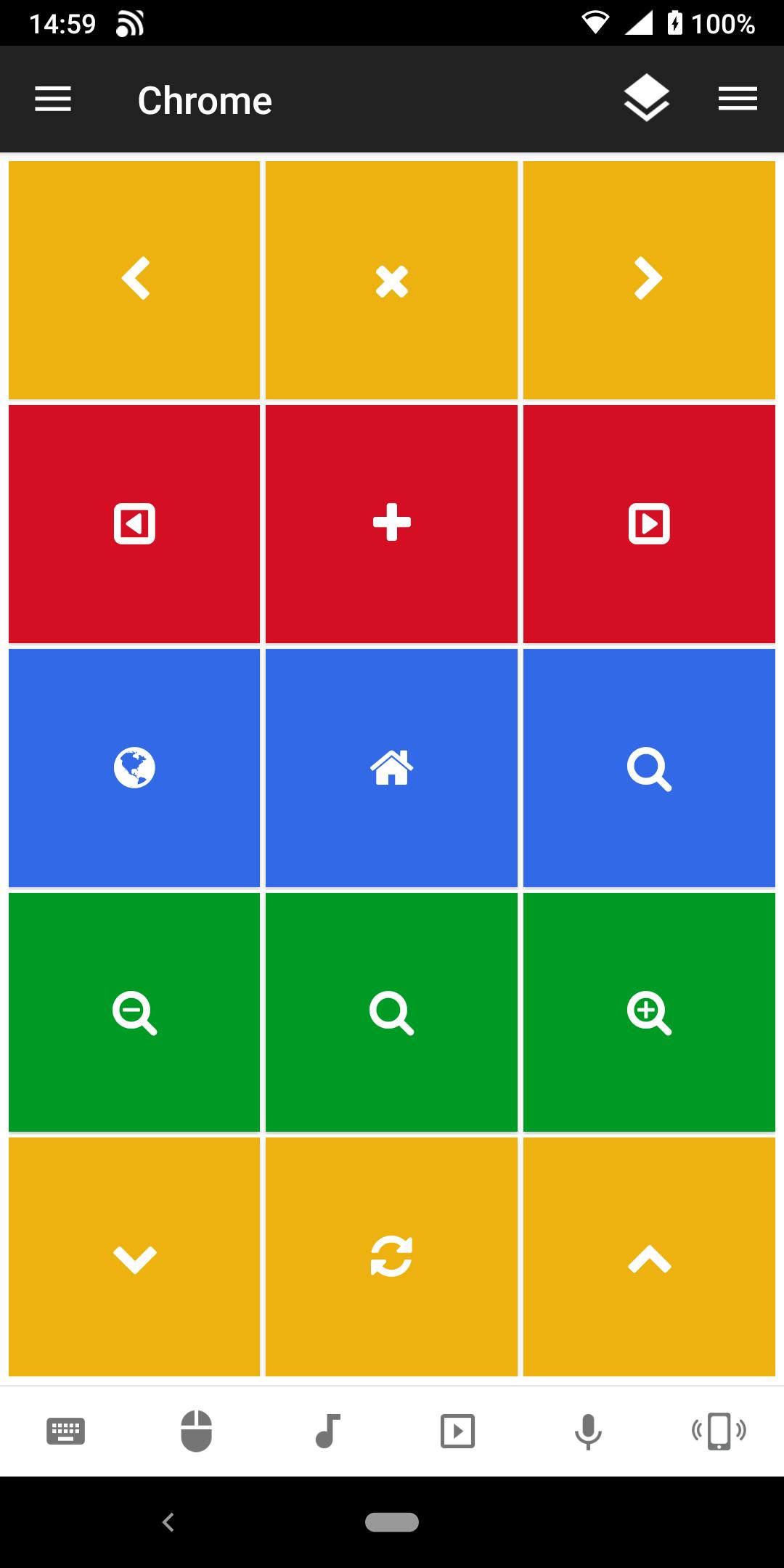 Er zijn uiteraard meer afstandsbedieningen beschikbaar die je eenvoudig via het plusteken kunt toevoegen. Ze zijn verdeeld over rubrieken als Input, Media, Presentation en Utility. Zet je bijvoorbeeld PowerPoint Basic erbij, dan heb je precies de toetsen die nodig zijn om een presentatie in PowerPoint te starten of te beëindigen en door de slides te bladeren. Voor nog wat meer controle kun je PowerPoint Advanced toevoegen. Er zijn verder speciale afstandsbedieningen voor bekende mediatoepassingen als Plex, MusicBee, Spotify, Winamp, VLC, YouTube en een handjevol meer. Ze bieden vaak wat meer dan de universele Media-afstandsbediening, die uiteraard meestal ook werkt. Verder zijn er afstandsbedieningen voor bekende browsers. We probeerden die voor Chrome. Deze geeft opties als het terug- of vooruit bladeren, scrollen door een pagina, bladeren door tabbladen, in- en uitzoomen of het openen van een nieuw tabblad. Er zijn ook afstandsbedieningen voor Firefox, Opera en Internet Explorer met vergelijkbare mogelijkheden. Raakt het overzicht met afstandsbedieningen wat te vol? Je kunt een afstandsbediening verbergen door er lang op te drukken.