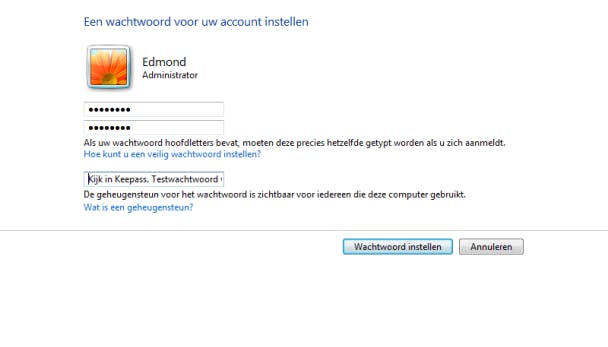Klik daarna op het account in het scherm waar alle accounts staan weergegeven en kies voor Een wachtwoord instellen. Typ dan het wachtwoord, de herhaling en de geheugensteun. Dit laatste kun je ook aan de gebruiker zelf overlaten als hij de volgende keer de pc gaat gebruiken. Hij kan je account dan niet meer gebruiken, maar logt in met zijn eigen account en kan van daaruit een wachtwoord instellen.