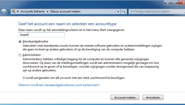 Deel je de pc met anderen, maak dan voor elke gebruiker een eigen account aan met een eigen wachtwoord. Open het onderdeel Gebruikersaccounts en Ouderlijk toezicht in het Configuratiescherm. Klik op Gebruikersaccounts toevoegen of verwijderen. Klik dan op Een nieuw account maken en geef het account een naam en kies voor Standaardgebruiker. Klik dan op Account maken.