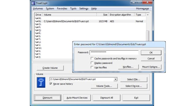 Om een versleutelde container te gebruiken als veilige plek om je bestanden te bewaren, moet je die container mounten oftewel koppelen. Start TrueCrypt en kies Select File. Selecteer dan het versleutelde bestand en kies in de lijst met stationsletters, de letter waaronder je het versleutelde bestand wil gebruiken. Klik dan op Mount. Typ nu het wachtwoord in en klik op OK of druk op Enter.