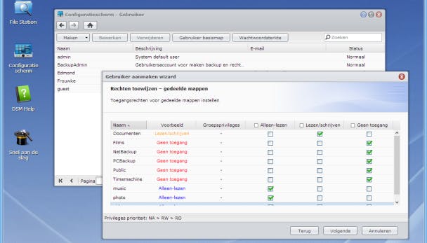 Ga naar de configuratiepagina van de NAS en log in met een beheerdersaccount, veelal is dat de admin. Open het onderdeel waar gebruikersaccounts kunnen worden gemaakt. Klik op Maken en maak net als op de Windows-pc voor elke gebruiker een eigen account. Ga dan naar de lijst Gedeelde mappen en geef de gebruiker per map wel of geen toegang, en beperkt de toegang eventueel tot Alleen lezen. Bij Lezen/schrijven kan de gebruiker elk bestand behalve zien ook bewerken.
