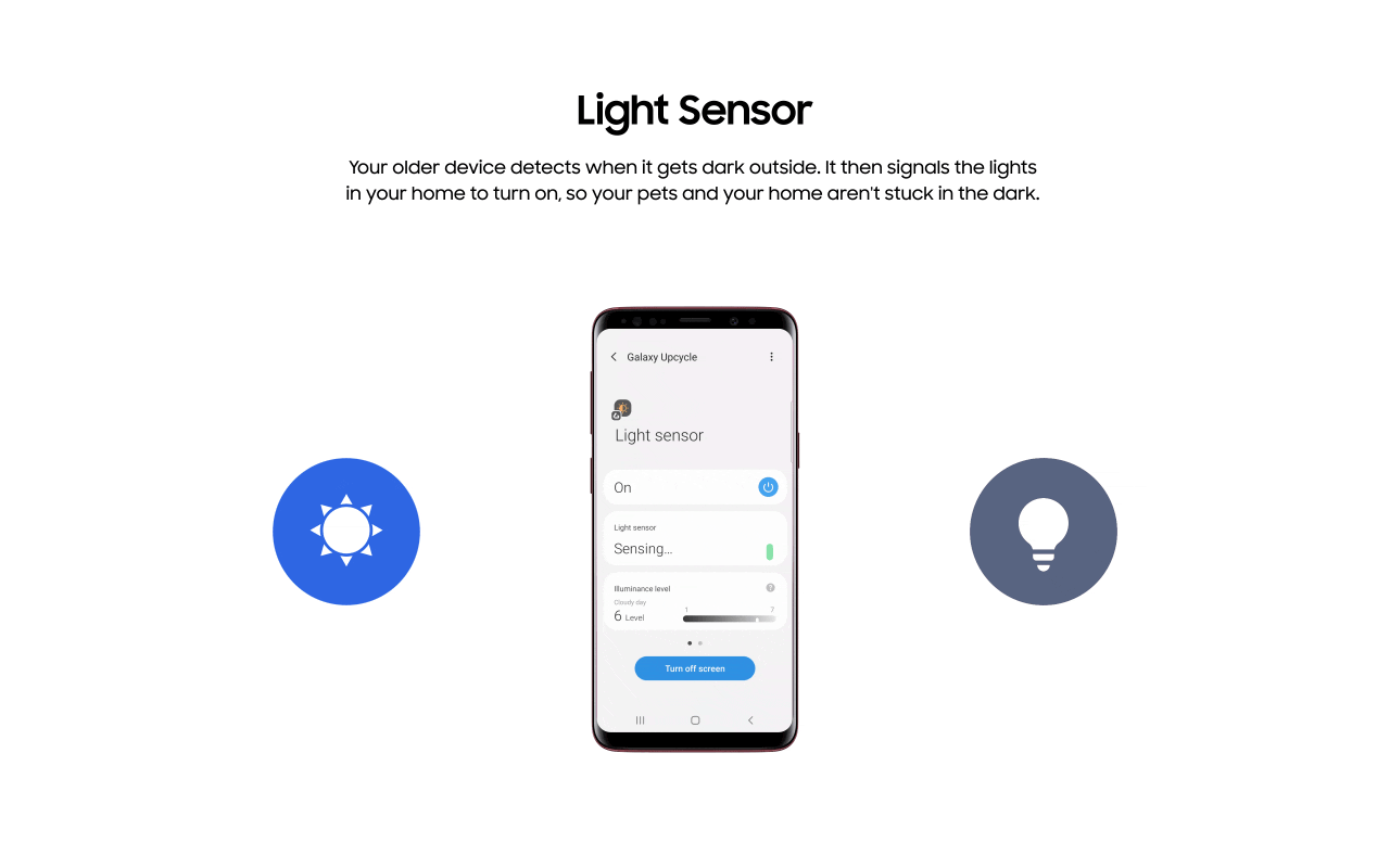 Met de lichtsensor kan je oude Galaxy-telefoon het licht in de kamer registreren. Wanneer er een bepaald lichtniveau is bereikt, kan je telefoon automatisch een van je slimme apparaten aan het werk zetten. Wordt het te donker in je kamer, dan kan je telefoon bijvoorbeeld een seintje naar je slimme lampen geven, die dan vervolgens aan gaan.