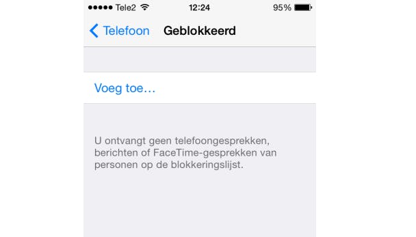 Om contactpersonen te blokkeren open je Instellingen en scroll je naar beneden naar Telefoon. Selecteer deze optie en kijk onder Gesprekken naar geblokkeerd. Als je deze optie aandrukt zie je Voeg toe... staan. Hiermee open je jouw contactlijst en kun je op naam zoeken naar de persoon die je wilt blokkeren. Tik de persoon aan en voeg deze toe aan de lijst. Je ontvangt nu geen inkomende oproepen, berichten of FaceTime-gesprekken meer van hem of haar.