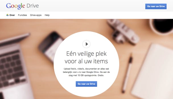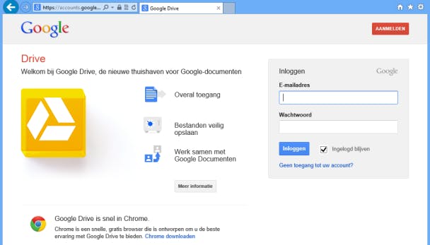Ga op je computer met de browser naar http://drive.google.com en meld je aan met je Google-account. In het (zeldzame) geval dat je die nog niet hebt, kun je je op dezelfde webpagina registreren.