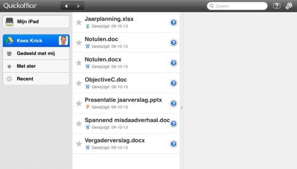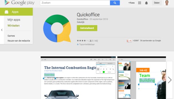 Zodra je enkele bestanden in Google Drive hebt geplaatst, kun je deze eenvoudig op je tablet binnenhalen om deze met QuickOffice te bekijken of te bewerken. QuickOffice download je gewoon in de applicatiewinkel van je Android-tablet of iPad.