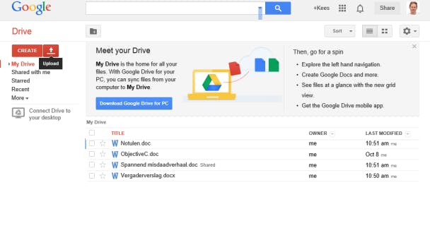 De makkelijkste manier om documenten beschikbaar te maken voor een tablet, is - zoals we ook in tip 1 al noemden - door online opslagruimte te gebruiken. Bestaande documenten op je pc, kopieer je dan eenvoudigweg naar een stukje online opslagruimte dat van jou is, zodat ze altijd en overal bereikbaar zijn via internet. We zullen dit illustreren aan de hand van Google Drive. Niet in de laatste plaats omdat deze dienst bijzonder goed samenwerkt met het eerder genoemde programma QuickOffice.
