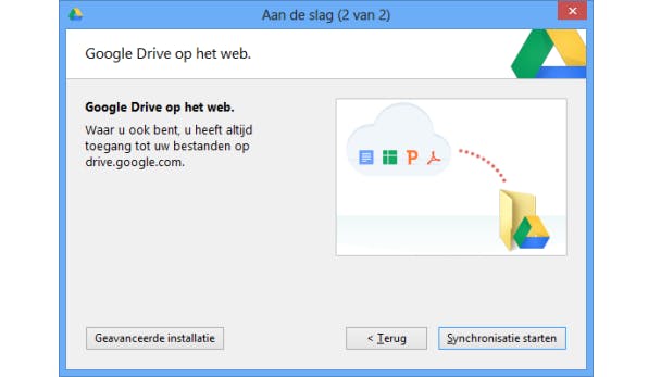 Na installatie wordt gevraagd om je aan te melden met je Gmail-account. Na enkele schermen kun je dan nog op Geavanceerde installatie klikken om zelf een map aan te wijzen, of op Synchronisatie starten om gewoon de standaardmap genaamd Google Drive onder de huidige gebruiker te gebruiken. Bestanden worden vanaf nu automatisch synchroon gehouden. Dat wil zeggen dat documenten die op Google Drive staan automatisch naar de zojuist gemaakte map Google Drive op je computer gekopieerd worden. Andersom worden bestanden die je lokaal in de map opslaat, vanzelf gekopieerd naar je online Google Drive.