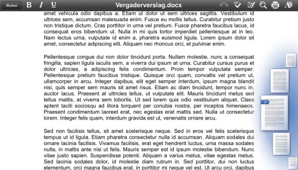 Kies je bijvoorbeeld een Word-document uit, dan zal het eerst worden opgehaald vanuit je Google Drive. Het bevindt zich nu immers nog online. Op dit punt is het essentieel dat je met internet verbonden bent. Vervolgens verschijnt het document op het scherm en kun je het doorlezen en bewerken. Is het een groot document? Houd je vinger op de rechterkantlijn gedrukt, vervolgens kun je via miniaturen razendsnel door het document bladeren.