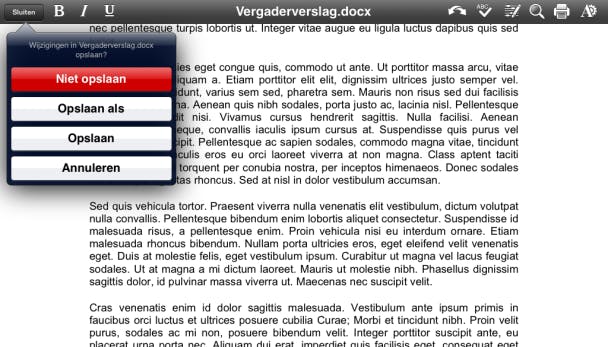 Sluit je een document, dan wordt gevraagd of je het document onder dezelfde of een nieuwe naam wil opslaan of dat je de wijzigingen wil negeren. Het bestand wordt direct online bewaard in Google Drive, zodat je ook op je computer en eventuele andere (mobiele) apparaten altijd over exact dezelfde versie van je documenten beschikt. Heeft je tablet tijdelijk geen internet, dan wordt het bestand lokaal bewaard en online bijgewerkt zodra de verbinding weer werkt.