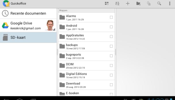 Op een Android-tablet kun je in QuickOffice ook documenten openen die zich ergens op de tablet zelf bevinden. In de linkerkolom van het hoofdscherm tik je hiervoor op SD-kaart. Vervolgens zie je een mappenstructuur waarin je naar bestanden kunt zoeken, net zoals je met een gewone computer gewend bent. Het is verstandig een eigen map aan te maken waarin je alle lokale documenten plaatst. Dan raak je nooit iets kwijt.