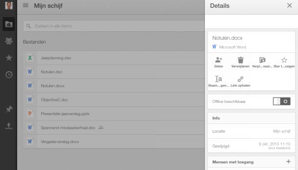 Wil je documenten delen, zodat niet alleen jijzelf maar ook anderen ernaar kunnen kijken en eventueel bewerken, dan is dit prima mogelijk met een app als Google Drive. Tik in het hoofdscherm op het informatie-pictogram bij het betreffende document en geef bij Mensen met toegang de personen op die bij dit specifieke document mogen. Je kunt aangeven of iemand het document mag bewerken, er opmerkingen in mag plaatsen, of het alleen maar mag weergeven. Op ditzelfde informatieblad kan met de schuifknop Offline beschikbaar overigens een lokale kopie van dit document op de tablet worden bewaard. Erg handig als je niet online bent.