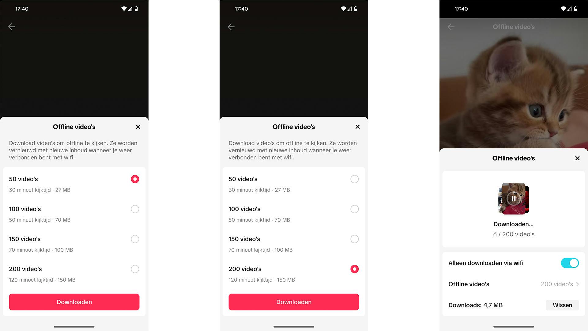 Het zou kunnen dat – per maart 2024 – je de benodigde update voor deze optie nog niet binnengehaald hebt. Check dus eerst of er een update voor TikTok beschikbaar is. Ja? Download en installeer de update en ga vervolgens naar de instellingen van de app. Onder de opties voor mobiele verbindingen en de cache tref je de mogelijkheid aan voor het offline bekijken van video’s. Daar kun je instellen hoeveel video’s TikTok voor je moet downloaden. Je kunt kiezen uit vier opties: vijftig, honderd, honderdvijftig of tweehonderd video’s. Zodra je op de downloadknop tikt, downloadt TikTok de video’s voor je.