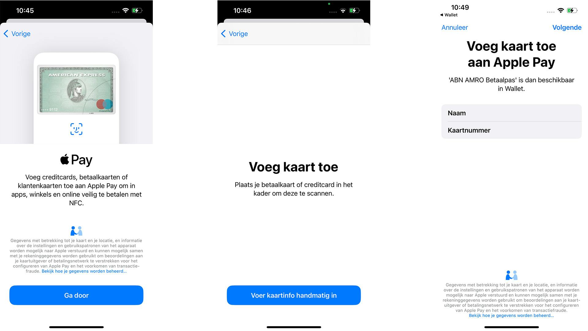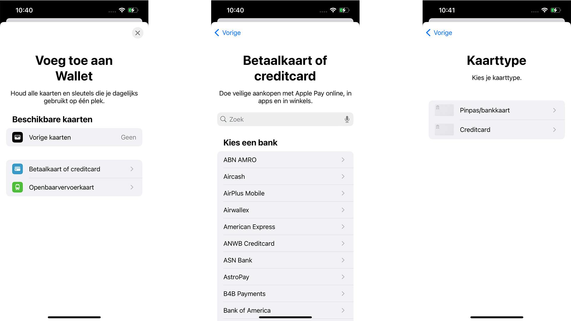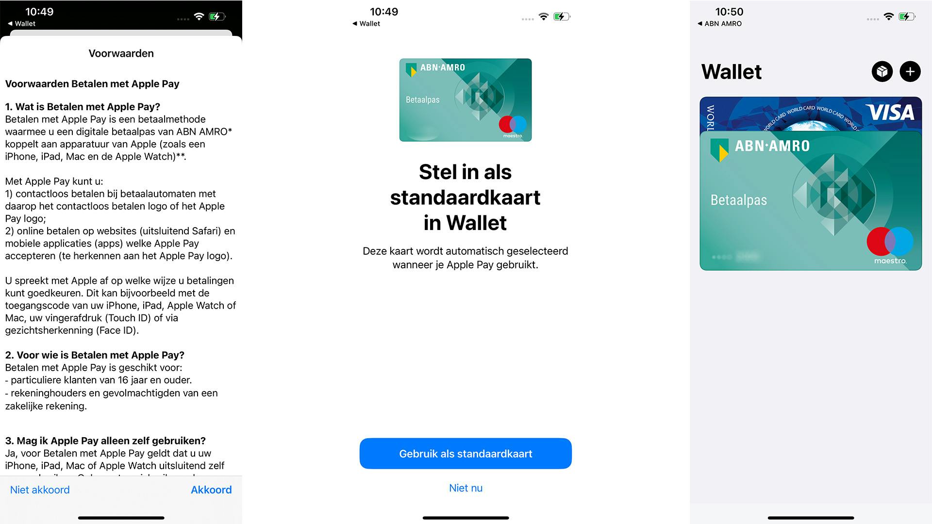 Het kan zijn dat je tijdens het proces nog extra informatie moet verstrekken, maar meestal pakt Apple automatisch de juiste gegevens erbij. Dit proces gaat beter wanneer je al een bank-app geïnstalleerd hebt waar je ook al ingelogd bent. Anders moet je tijdens het toevoegen de kaart registreren. Allemaal geen probleem, want dit neemt slechts een paar minuten in beslag. Het is iets om even scherp op te zijn. Na het toevoegen van de kaart is het mogelijk hem als standaardoptie in te stellen; dan betaal je voortaan automatisch met die ingestelde optie.