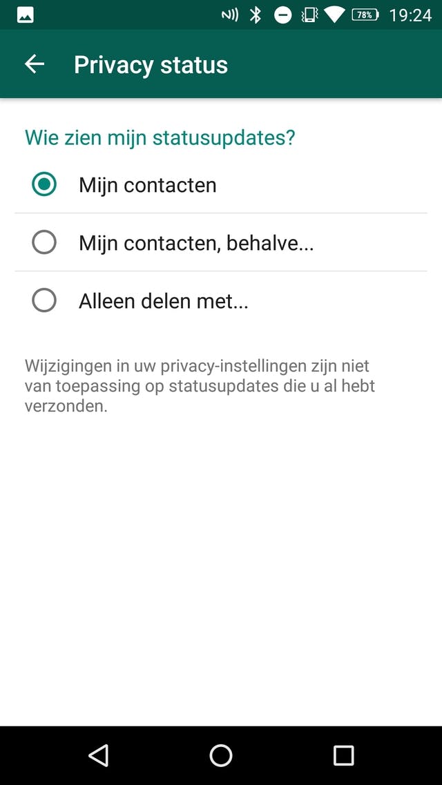 Als je om welke reden dan ook je WhatsApp Status niet met al je contacten wilt delen, kun je bepaalde mensen uitsluiten. Ga daarvoor naar de het tabblad Status in de app, klik op Privacy en je ziet drie opties. Als Mijn contacten aangevinkt is, krijgen al je contacten je status te zien. Bij Mijn contacten behalve kun je personen aangeven die hem niet mogen zien, maar het is ook mogelijk dat je de Status naar slechts een paar contacten wil sturen. Gebruik daarvoor de Alleen delen met en kies de mensen die je Status mogen zien.
