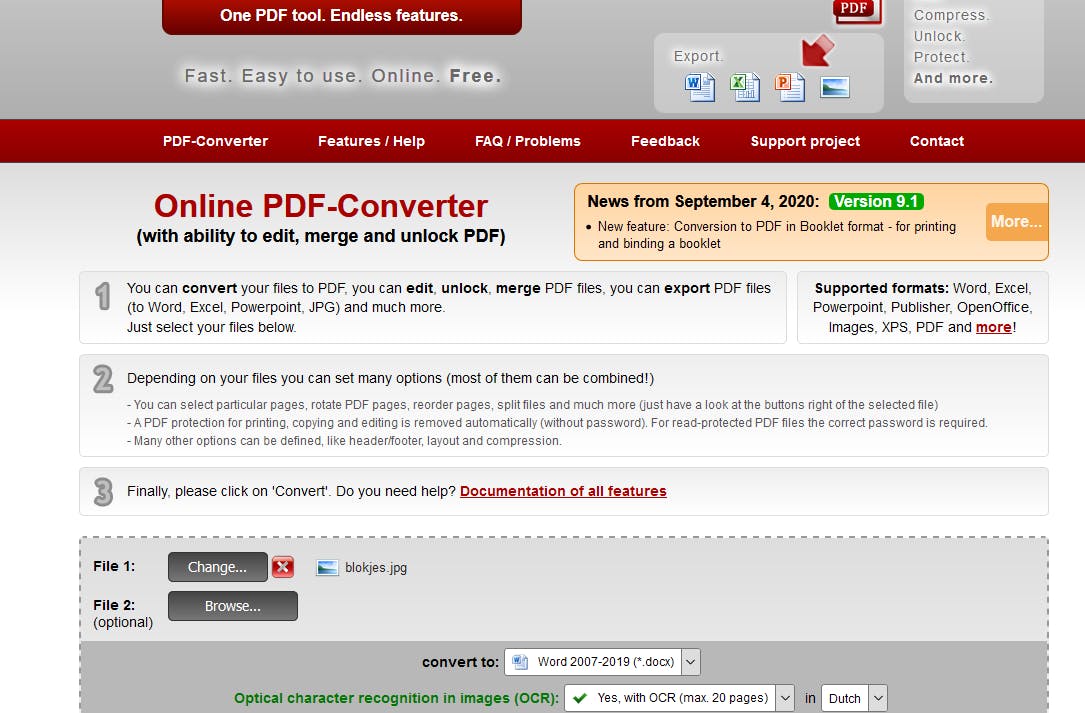 Om het vlot te laten verlopen, moet je hier twee instellingen aanpassen. Bij Convert to kies je het uitvoerformaat. Dat kan zijn Word 2007-2019, Word 2003, OpenDocument Tekst, ePub, maar ook een doorzoekbare pdf of een ander formaat. Wanneer je de Word-indeling selecteert, vraagt het online programma in welke taal het document is opgesteld. Hier kies je dus Dutch. Heb je nog een foto van een tweede, derde of volgende pagina’s dan herhaal je de instellingen. Tenslotte klik je op de rode knop Convert. De browser zal automatisch aangeven wanneer het geconverteerde document klaar is om te downloaden. Het resultaat is behoorlijk. De online converter heeft zelfs de kolommenstructuur behouden, het aantal ocr-foutjes is beperkt (maar zijn er wel) en zelfs de foto in het document is als een afzonderlijk bestand toegevoegd.