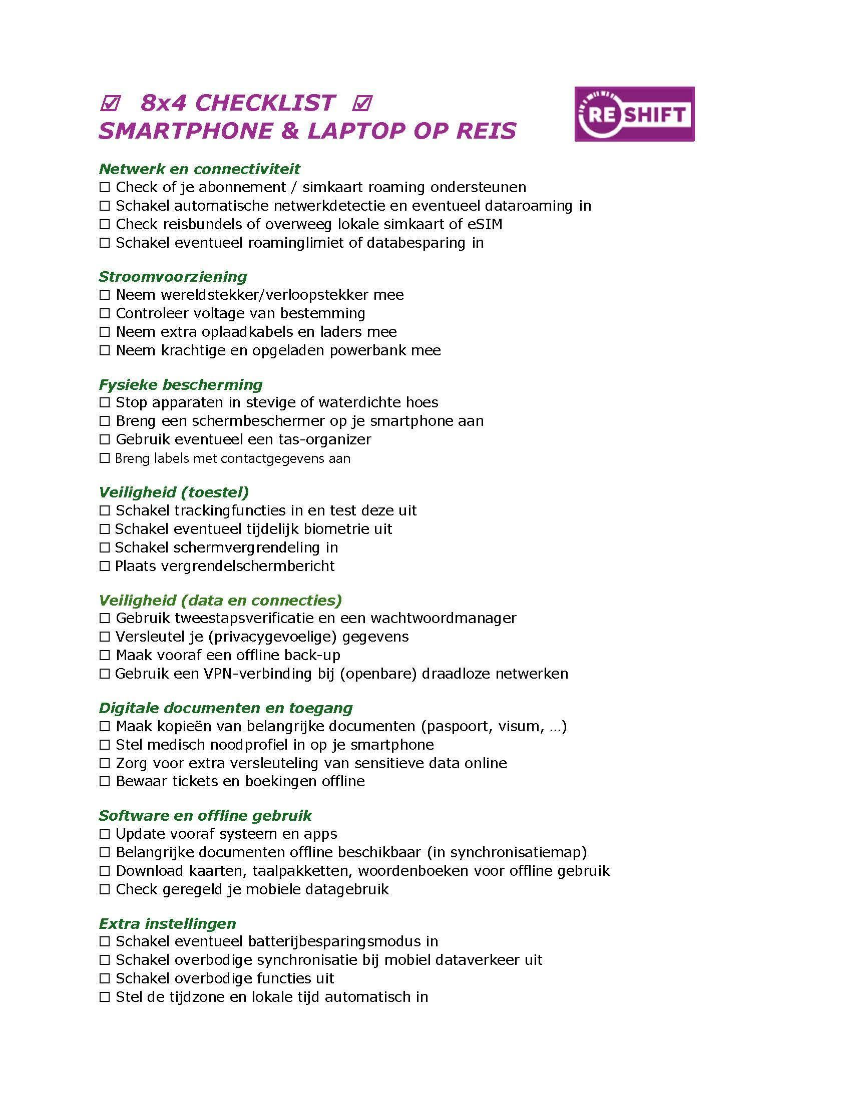 • Voor vertrek: stel roaming correct in of kies een eSIM of lokale simkaart • Neem de juiste opladers, kabels en eventueel een powerbank mee • Bescherm je toestellen fysiek met hoesjes en tassen en digitaal met opsporingsfuncties • Gebruik tweestapsverificatie, een wachtwoordmanager en versleuteling voor je data • Maak back-ups en sla belangrijke documenten ook offline en versleuteld op • Download kaarten, taalpakketten en documenten voor offline gebruik • Bespaar batterij en data met slimme instellingen onderweg