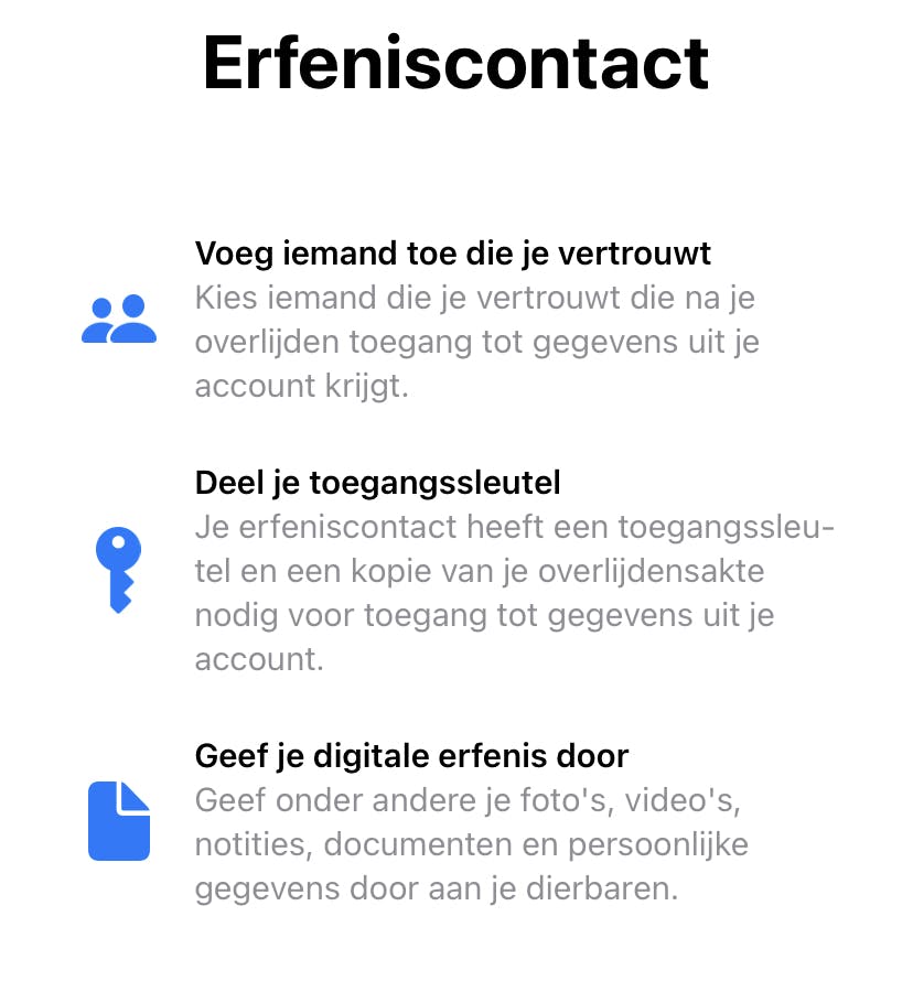 De toegangssleutel in combinatie met een overlijdensakte is nodig om vervolgens toegang te krijgen tot jouw data. Het erfeniscontact dient via deze Digitale-erfenispagina een verzoek te doen om toegang te krijgen tot het account van een overleden vriend of familielid. Het erfeniscontact heeft na goedkeuring van de aanvraag drie jaar lang toegang tot je account. Daarna wordt je account permanent verwijderd.