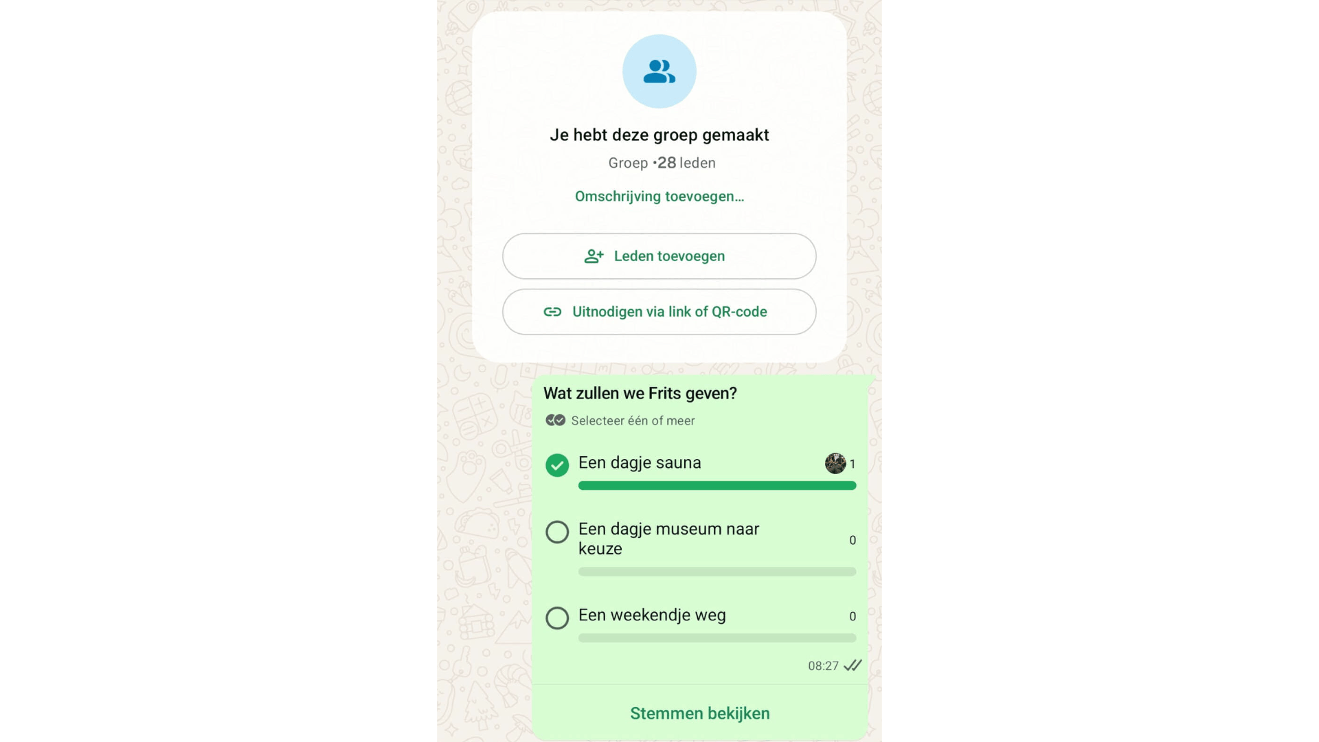 Wist je dat je in groepen nu ook peilingen (polls) kunt maken? Handig als je een datum moet prikken of moet stemmen over het cadeau voor de juf, een familielid of een collega. Open een groepsgesprek en tik rechts van het chatvenster op het paperclipje. Er opent een menu met opties en daaruit kies je voor Peiling. Vervolgens werk je de peiling verder uit door een vraag te stellen en een aantal antwoorden toe te voegen. Daarbij kun je ervoor kiezen om de leden van de groep alleen een enkel antwoord te laten geven of meerkeuze. Iedereen in de groep kan zien welke antwoorden de anderen hebben gegeven, dus het is geen anonieme peiling.