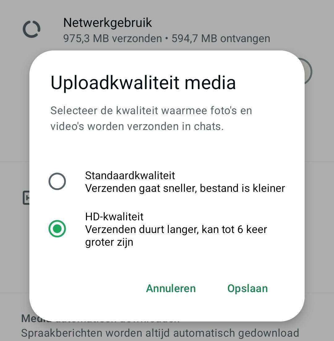 WhatsApp staat erom bekend dat het je foto’s flink comprimeert. Een prachtige, scherpe foto wordt dan verkleind om data te besparen. Dat is prima voor een relatief klein smartphonescherm, maar aangezien je WhatsApp ook op een desktop kunt gebruiken, is die compressie ook niet altijd wenselijk. Zeker niet als je een bepaalde foto bijvoorbeeld wilt afdrukken op hoge kwaliteit. Gelukkig kun je die compressie omzeilen. Er is namelijk een aparte instelling voor het versturen en voor het ontvangen van foto’s en video’s die je vindt onder Instellingen / Opslag en data. Kijk bij het onderdeel Uploadkwaliteit media. Kies daar de gewenste optie. Vlak onder de genoemde uploadoptie voor foto’s vind je de optie voor het ontvangen van foto’s en video’s. Ook hier kun je dan kiezen tussen Standaard, HD of Automatisch.