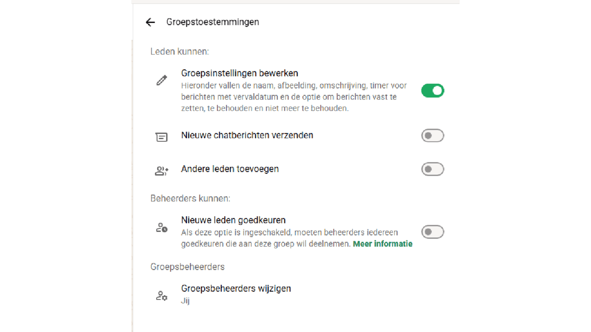 Een groep aanmaken in WhatsApp kan iedereen, maar een groep gezellig en overzichtelijk houden kan soms wat lastig zijn. We kennen allemaal wel die ene buurt- of familieapp die uit de hand loopt. Als beheerder kun je die chaos voorkomen. Via de groepsinstellingen (tik op de naam van de groep) kun je de teugels aantrekken. Heb je een groep puur voor mededelingen, zoals bij een sportclub? Stel dan in dat alleen beheerders berichten mogen sturen. Dat kan overigens alleen als jij degene bent die de groep heeft gestart of als je zelf ook beheerder bent. Om alleen beheerders de mogelijkheid te geven om berichten te sturen, haal je bij Groepsinstellingen het vinkje weg bij Nieuwe chatberichten verzenden.