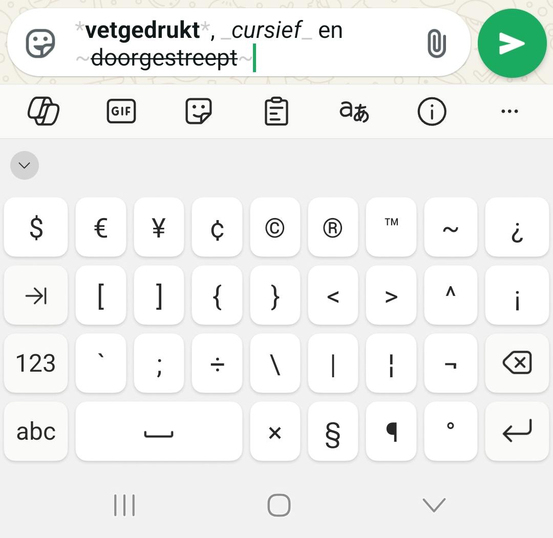 Tekst opmaken: Wil je iets benadrukken? Zet een woord tussen sterretjes (zoals *dit*) en het wordt vetgedrukt. Gebruik underscores (_tekst_) voor cursief en tildes (~tekst~) om tekst door te strepen (handig voor afgevinkte lijstjes!).