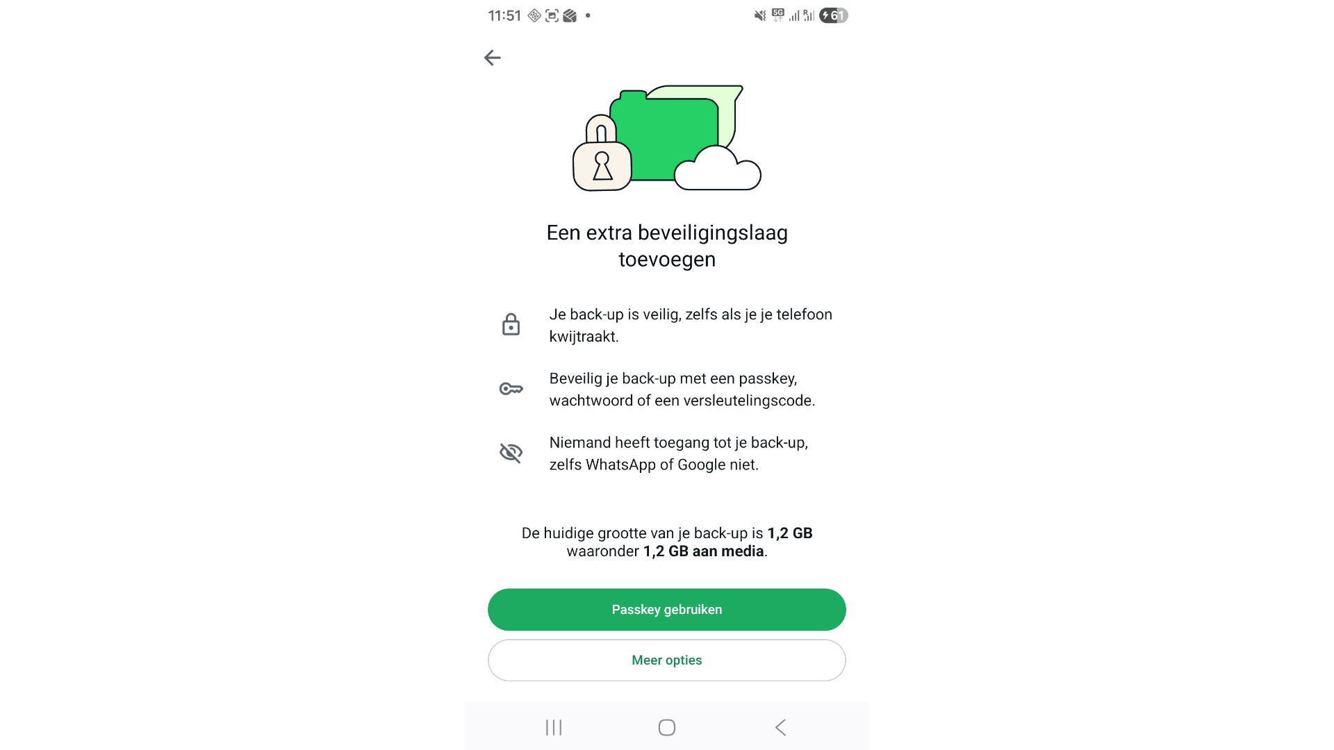 Je WhatsApp-geschiedenis zit vol kostbare herinneringen en afspraken. Veelal wil je die bewaren. Op Android gaat je back-up naar Google Drive, op de iPhone naar iCloud. Zet de frequentie op ‘Dagelijks’ of ‘Wekelijks’. Stel dat je telefoon wordt gestolen of onherstelbaar kapot gaat, dan ben je dus bijna een maand aan gesprekken kwijt als je de back-up standaard op maandelijks hebt ingesteld. Een back-up terugzetten kan trouwens alleen als je WhatsApp opnieuw installeert. De app vraagt er dan vanzelf om. Klik niet te snel op ‘Nu niet’, want je krijgt later geen tweede kans meer om die oude berichten samen te voegen met nieuwe. En dan nu het stukje beveiliging waar bijna niemand aan denkt. De berichten in WhatsApp zijn natuurlijk extreem goed versleuteld. Maar de back-up in de cloud (bij Google of Apple) is dat standaard niet op diezelfde manier. In theorie kunnen hackers of overheden daar dus bij. Wil je dit helemaal dichttimmeren? Zet dan End-to-end versleutelde back-up aan in de instellingen. Je beveiligt je back-up dan met een eigen wachtwoord. Zonder dat wachtwoord komt niemand erin, zelfs WhatsApp niet. Het instellen van end-to-end-versleuteling doe je via Instellingen / Chats / Back-up van chats. Onderaan tik je op de optie End-to-end versleutelde back-up en je krijgt de mogelijkheid om te kiezen tussen een standaard wachtwoord, passkey (gezicht of vingerafdruk) of een 64-cijferige beveiligingscode (via de knop Meer opties). Let wel goed op: Vergeet je dit wachtwoord? Dan ben je je back-up écht voorgoed kwijt. Er is geen ‘wachtwoord vergeten’-knop. Doe dit dus alleen als je goed bent in het onthouden van wachtwoorden.