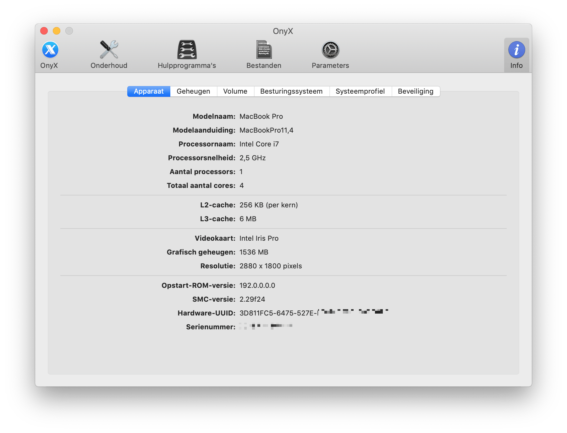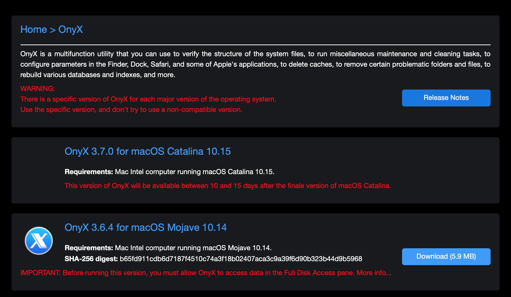 Het is belangrijk dat je de juiste versie van OnyX voor jouw versie van macOS downloadt. Elke versie van macOS heeft namelijk net iets andere functies en als je een verkeerde versie van het programma gebruikt, kan het zijn dat functies niet juist worden uitgevoerd. Om te bepalen welke versie van macOS je hebt, klik je links bovenin op het Apple-icoontje en kies je voor Over deze Mac. Je ziet de naam van de macOS-versie bovenin weergegeven worden. In de meeste gevallen zal dit macOS Sierra, macOS High Sierra of macOS Mojave zijn. Ben je een early-adopter, dan zie je hier het spiksplinternieuwe macOS Catalina staan. Ga naar deze website en klik op de knop Download achter het juiste besturingssysteem. Dubbelcheck of je werkelijk de goede versie hebt, want een andere versie kan ervoor zorgen dat je systeem vastloopt of dat bewerkingen niet juist worden uitgevoerd.