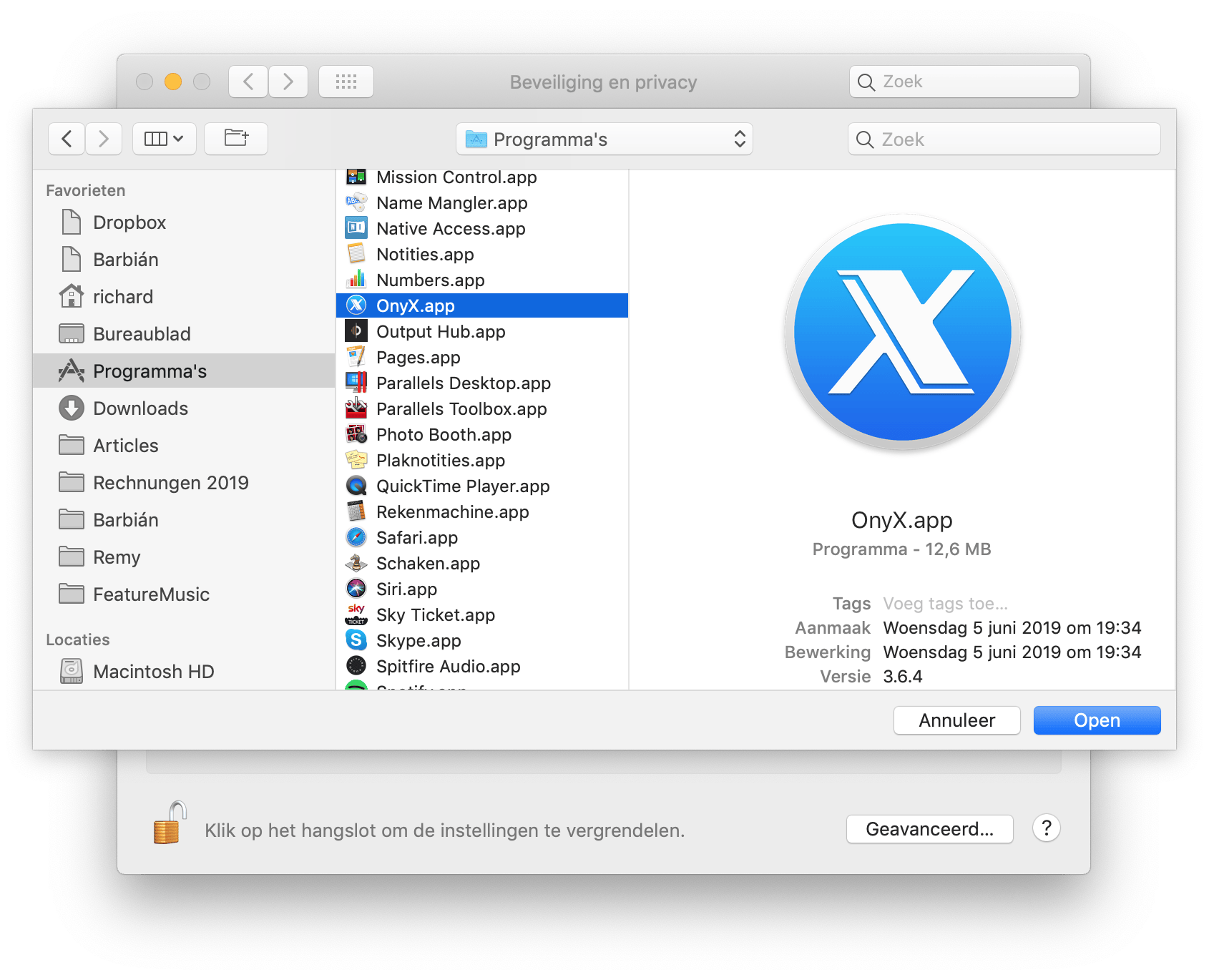 Draait je systeem op macOS Mojave of macOS Catalina, dan moet het programma schijftoegang geven. Ga naar Systeemvoorkeuren en klik op Beveiliging en privacy. Selecteer het tabblad Privacy. Klik links op Volledige schijftoegang. Voer je naam en wachtwoord in, klik op het plusje en navigeer naar de programmamap. Selecteer OnyX en kies voor Open. Je hebt OnyX nu toegang gegeven om je schijf te wijzigen en bewerkingen aan het systeem door te kunnen voeren.