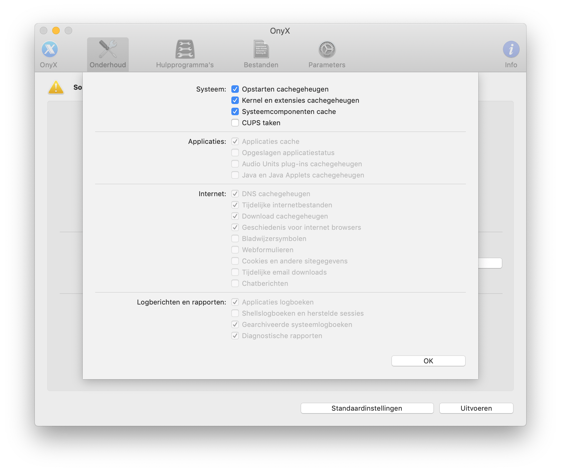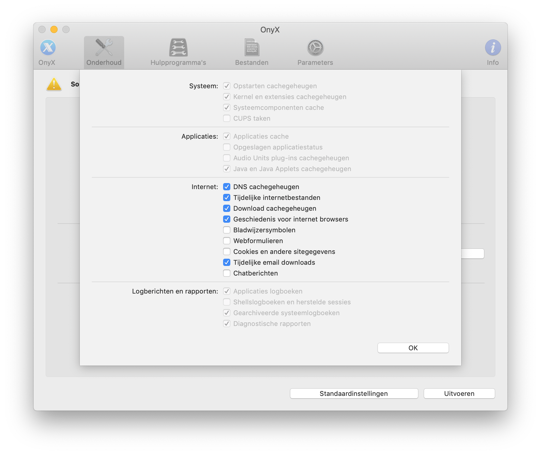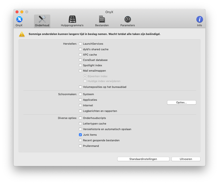 Ga naar het tabblad Onderhoud en je ziet een overzicht van alle taken die je kunt uitvoeren. Je zet een vinkje voor het onderdeel en klikt op Uitvoeren om al deze taken na elkaar te doen. Dit kan echter wel een tijdje duren, dus het is aan te raden om te beginnen met wat kleine taken. Het is goed om te weten wat elke optie eigenlijk precies doet. Je vindt een Engelse uitleg over alle onderdelen als je in OnyX naar Help / OnyX Help gaat en op Onderhoud klikt. OnyX biedt je drie verschillende onderhoudsopties: Herstellen, Schoonmaken en Diverse opties. Laten we beginnen bij het schoonmaken van je systeem. Je vindt hier vier dingen die je kunt schoonmaken: Systeem, Applicaties, Internet en Logberichten en rapporten. Als je op Opties klikt, zie je per onderdeel welke dingen worden schoongemaakt.