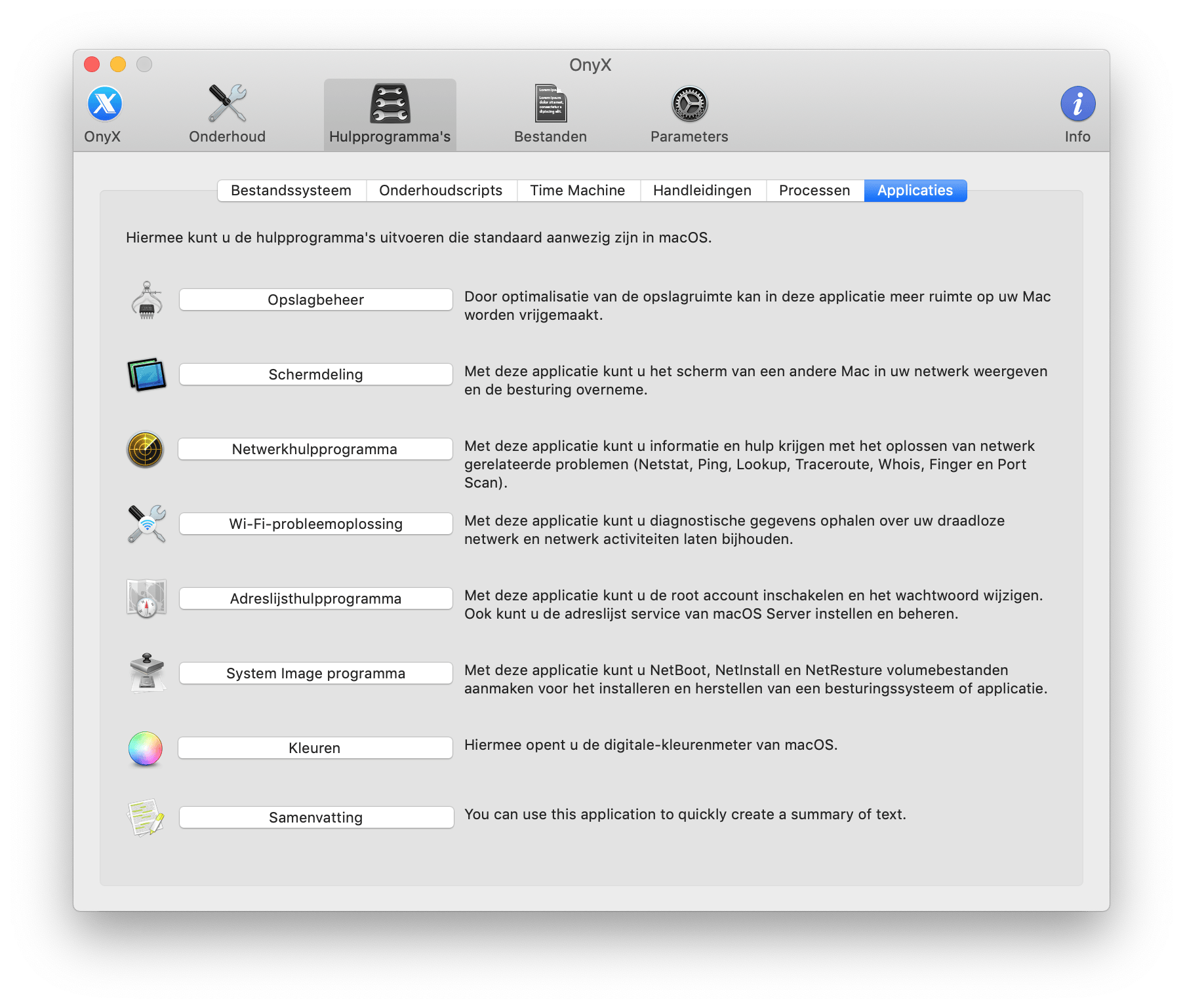 Verder naar het tabblad Hulpprogramma’s. Als eerste kun je de structuur van het bestandssysteem controleren. Klik op Controleren om de test uit te voeren, dit kan een tijdje duren, dus het is niet aan te raden dit te doen als je in tijdnood zit. Het tweede tabblad is Onderhoudscripts, hier kun je instellen hoe vaak OnyX de interne macOS-onderhoudstool launchd moet uitvoeren. Wil je precies weten wat elk account precies op de Mac doet, dan kies je Inschakelen bij Processen. Klik op Weergeven/Verversen om de lijst te verversen. Let op dat dit bestand enorm veel ruimte kan gaan innemen als het elke kleine taak die je op de Mac doet, gaat vastleggen. Kijk bij Applicaties om standaard hulpprogramma’s van macOS te openen die op jouw systeem zijn geïnstalleerd.