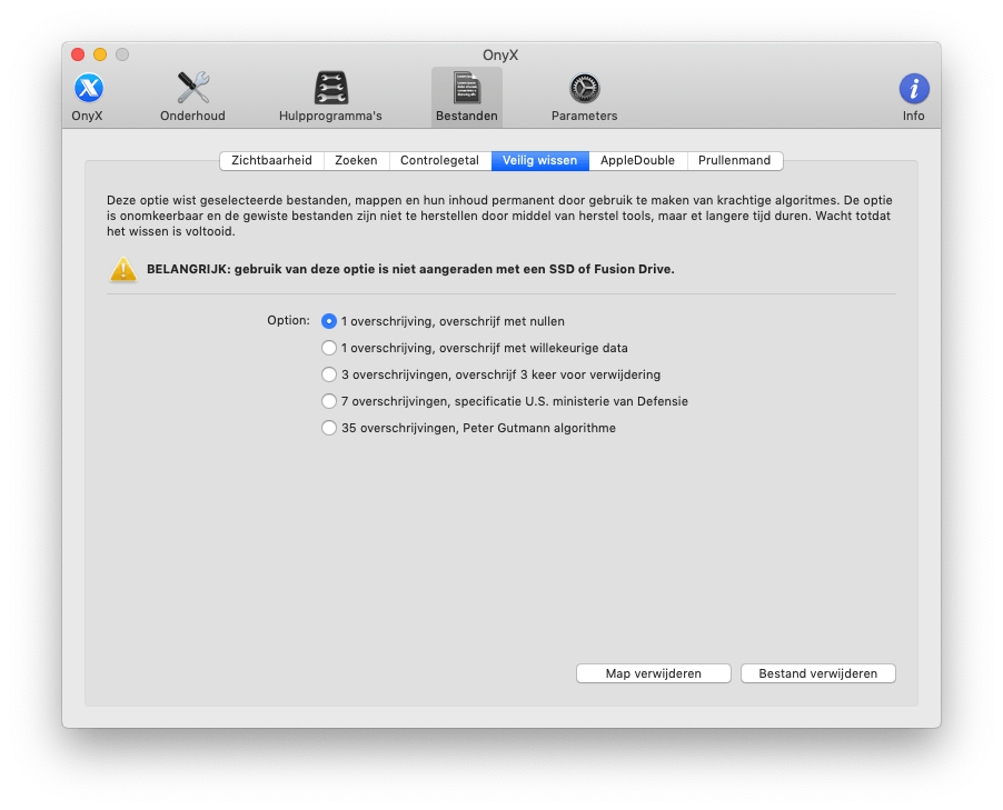Het derde tabblad heet Bestanden, bij Zichtbaarheid kun je bepaalde mappen of bestanden onzichtbaar maken. Klik op Verberg map en bevestig dat OnyX de Finder mag herstarten. Selecteer nu de map die je wilt verbergen. Je maakt de map weer zichtbaar door voor Toon map te kiezen. Helaas heb je geen overzicht in OnyX welke mappen of bestanden je onzichtbaar hebt gemaakt. De opties Veilig wissen en Prullenmand gebruik je alleen als je een normale harde schijf hebt. Voor ssd’s is dit niet nodig en zelfs schadelijk. De optie overschrijft namelijk sectoren van de schijf met willekeurige bytes zodat verwijderde bestanden niet teruggezet of hersteld kunnen worden. Dit principe werkt alleen bij een hd, een ssd functioneert anders.