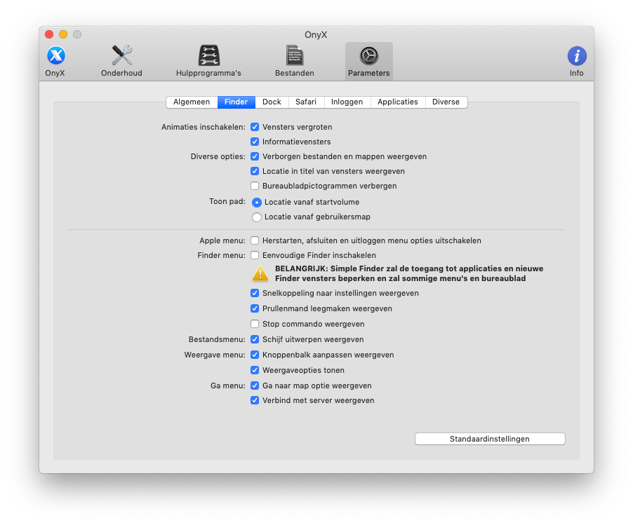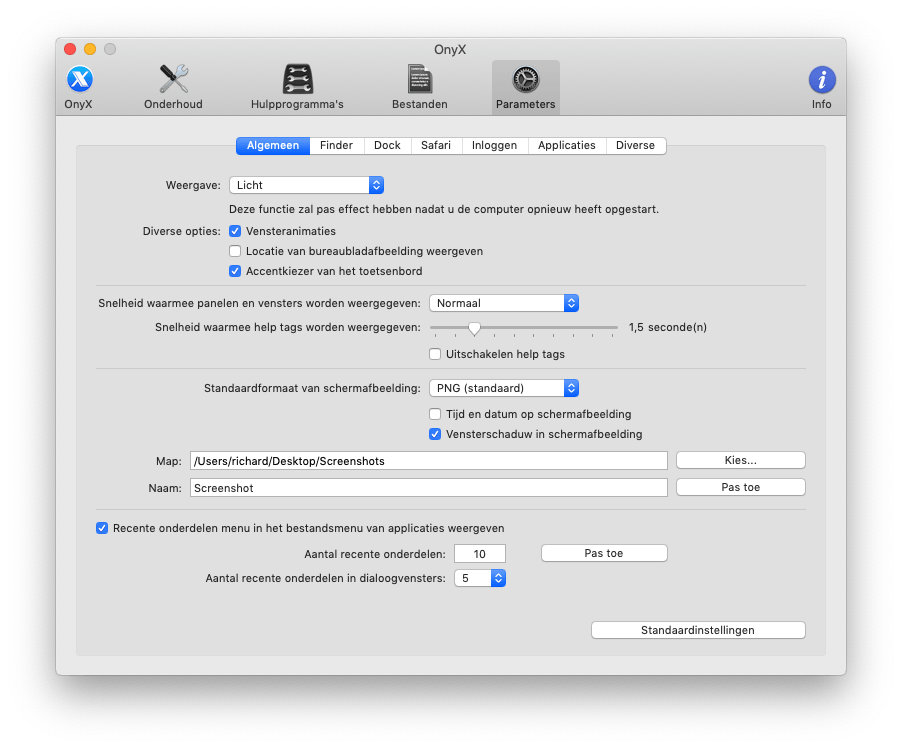 Het tabblad Finder verenigt een paar opties die je allemaal via de Terminal kunt doen, maar met OnyX een stuk makkelijker zijn. Zet bijvoorbeeld een vinkje voor Verborgen bestanden en mappen weergeven of kies voor Locatie in titel van venster weergeven. Eén tabblad verderop kun je opties voor het Dock aanpassen. Hier kies je bijvoorbeeld aan welke kant de Dock zich moet bevinden. Een handige optie is Alleen geopende applicaties weergeven. Zo word je niet afgeleid door al je geïnstalleerde applicaties maar zie je alleen de programma’s die je hebt geopend. Bij het tabblad Safari kun je kiezen hoe lang de browser bezochte websites in de geschiedenis moet bewaren. Kies achter Maximaal aantal dagen in geschiedenis bijvoorbeeld voor 1 als de browser elke dag je geschiedenis mag wissen.