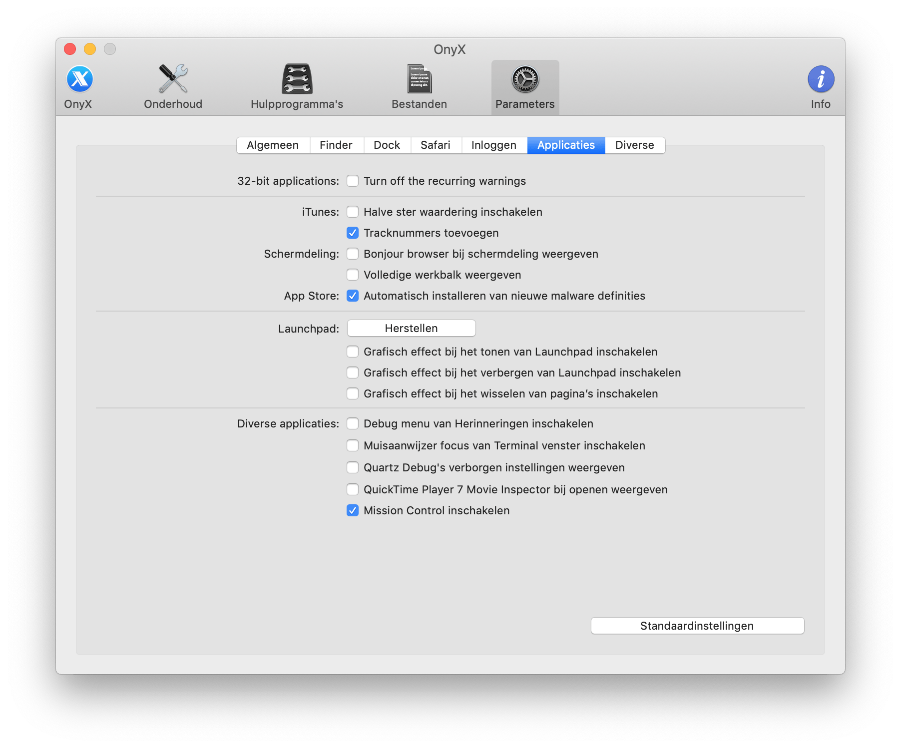 Met een verkeerde versie van OnyX kan het zijn dat functies niet juist worden uitgevoerd