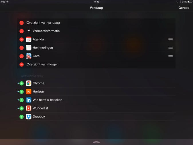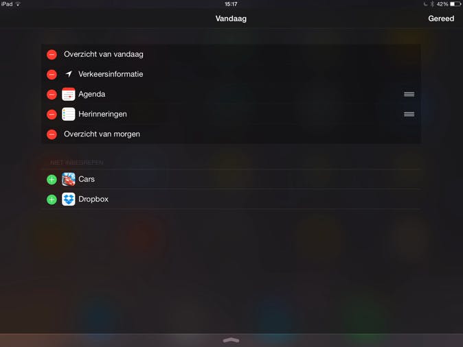 Om een widget te deactiveren, veeg je van boven naar beneden om het Berichtencentrum tevoorschijn te toveren. Scrol nu helemaal naar onderen, tot je de knop Wijzig ziet. Druk hierop en druk vervolgens op het minteken voor de widget die je niet meer in het Berichtencentrum wilt weergeven. Heb je alle ongewenste widgets uitgeschakeld, druk dan rechtsboven op Gereed en je zult zien dat de betreffende gegevens niet meer worden getoond.