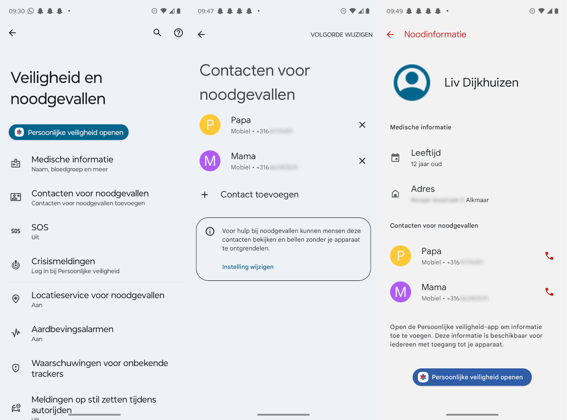 Voeg ook SOS-contactpersonen toe. Waarschijnlijk ben je deze optie in het instellingenvenster Veiligheid en noodsituaties of Veiligheid en noodgevallen al tegengekomen. Via Contacten voor noodgevallen / Contact toevoegen selecteer je één of meerdere personen in de contactenlijst.